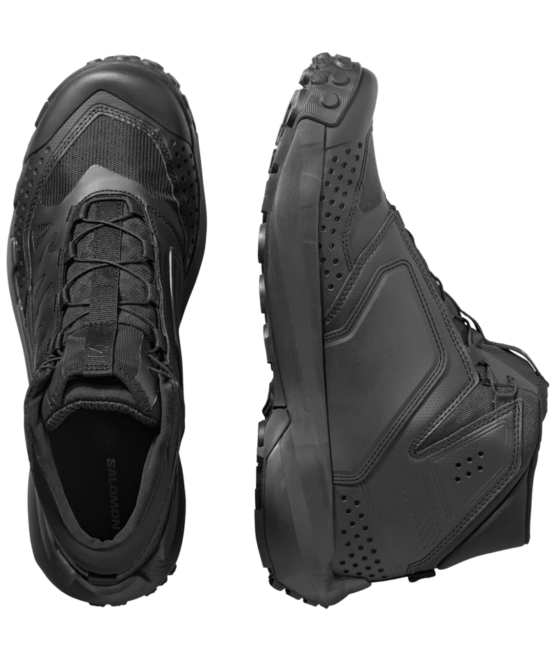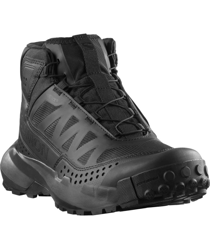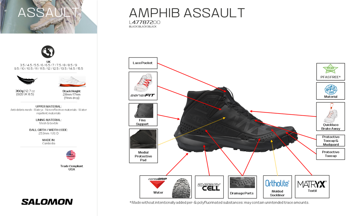 For missions in and out water the FORCES AMPHIB ASSAULT is designed to be compatible with most combat swim fits and provides under foot protection from rocky shores and caving ladders. Non-absorbent upper materials, strategically placed mesh panels and drain holes ensure quick evacuation of water once on land.