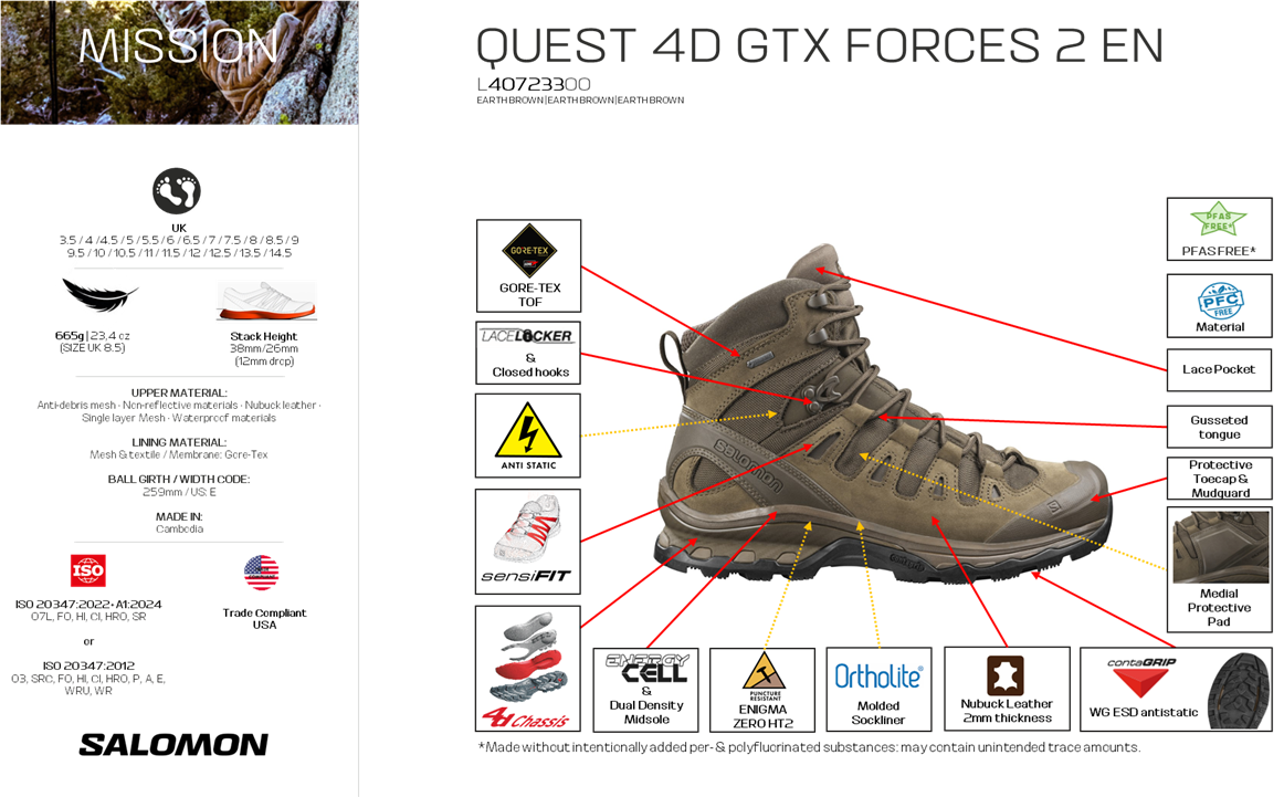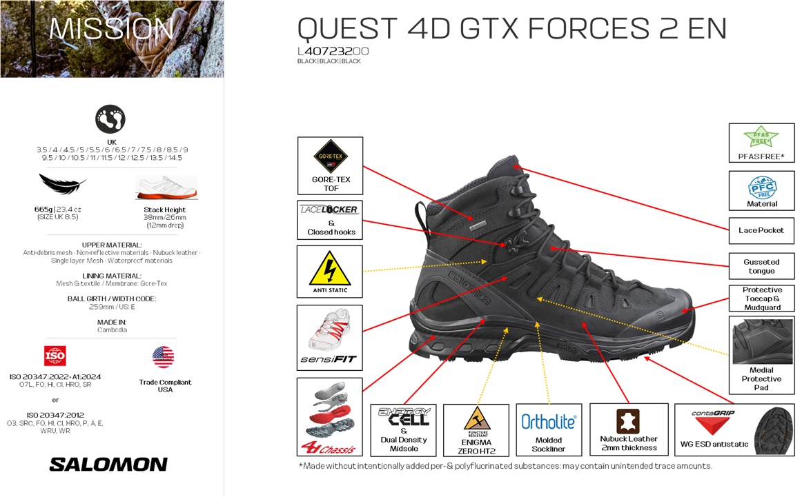 The QUEST 4D GORE-TEX FORCES 2 EN gives you the support and grip of a mountain boot, but still has the flexibility to take a knee or sprint to position in tough conditions. Includes the added protection of a waterproof Gore Tex membrane for extended use in severe wet weather conditions. MADE WITH PFAS CHEMICALS.
