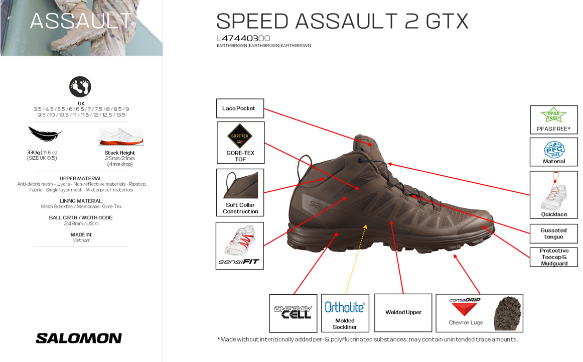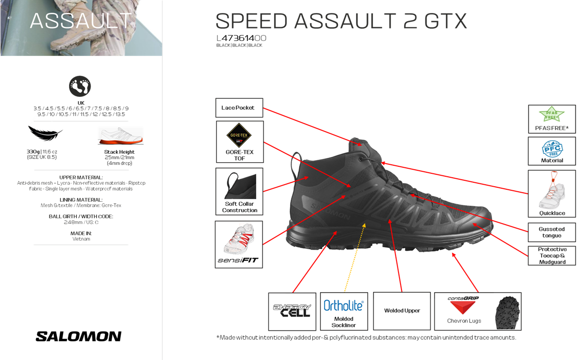 Light and fiercely gripped, the SPEED ASSAULT 2 GTX offers everyday comfort and more features than its predecessor. With these tactical boots you’ll be equipped for speed and agility from desert deployment to jungle training camps. Includes a waterproof Gore Tex membrane for extended use in severe wet weather conditions. MADE WITH PFAS CHEMICALS.