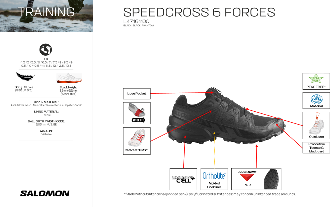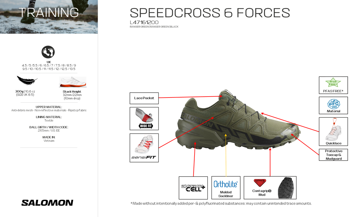The SPEEDCROSS 6 FORCES is designed for fast-paced operations where grip and precision are crucial. This version offers wider feet more space and enhanced comfort. The boot’s design is inspired by fast trail runs in pathless, boggy terrain.
