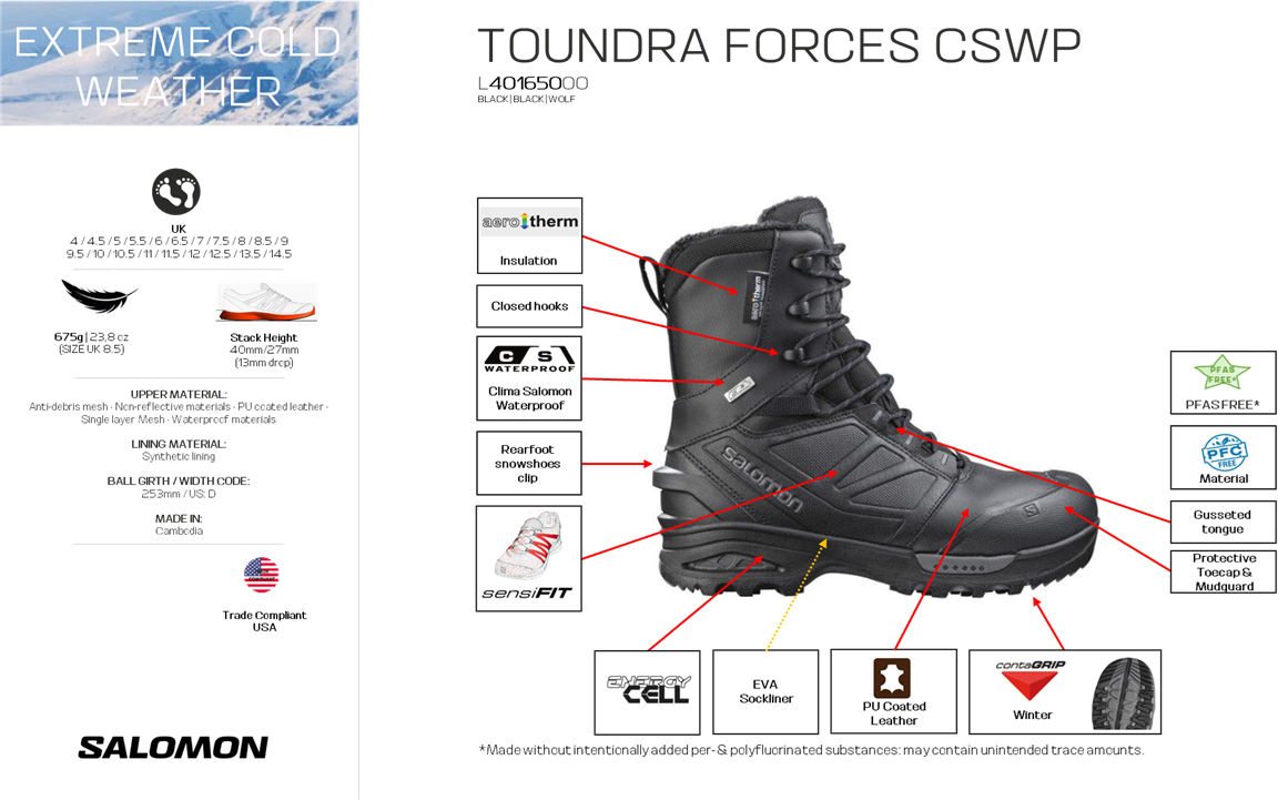 • When the mission is forged through the coldest conditions this tactical winter boot is fully prepared. Completely waterproof, insulated for warmth to -40°c and armed with fierce lugs for traction in snow and ice, TOUNDRA FORCES CSWP is advanced technology for artic patrols, missions and deployments. Now available in a winter specific color.