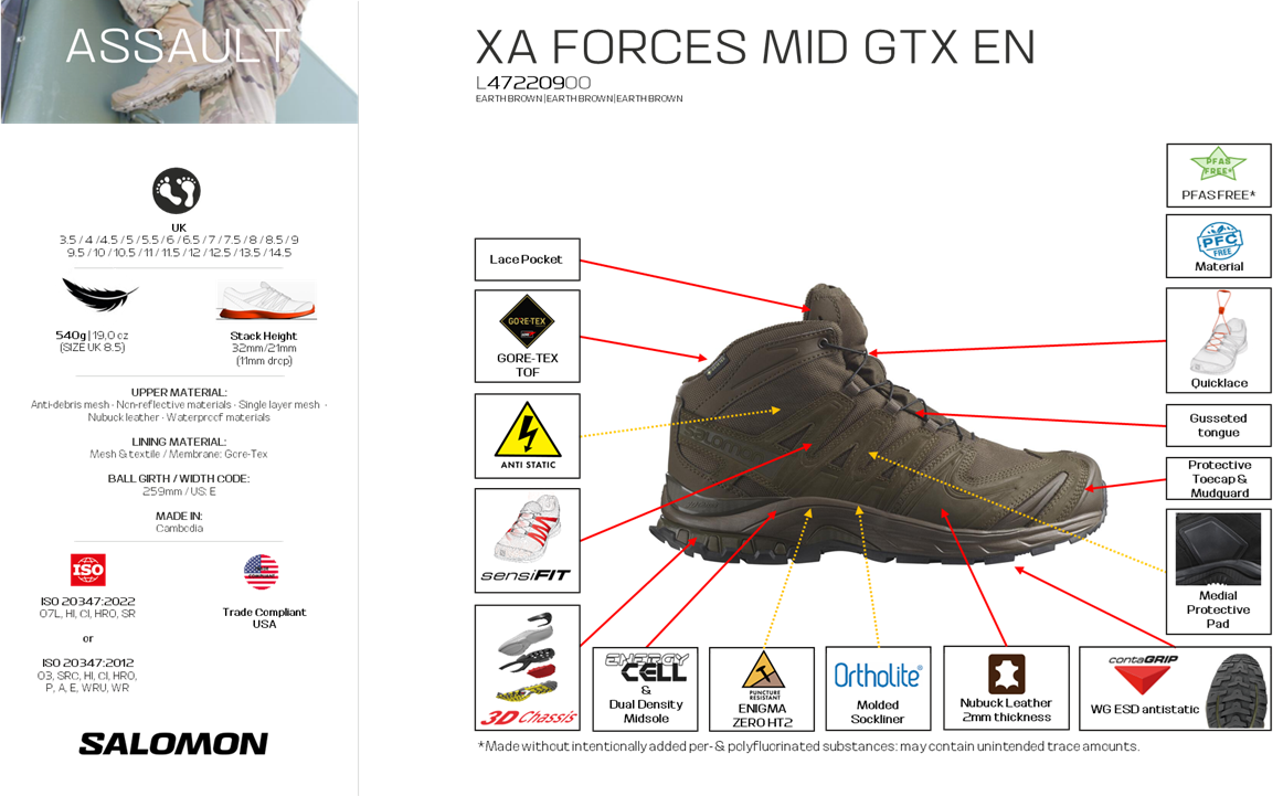 Designed for precise, fast and agile police or military operations. Inspired by possibly Salomon’s most famous trail running shoe, the XA Pro 3D. The ISO-certified XA FORCES MID EN impresses with its aesthetics, light weight and grip, making it a versatile tactical boot.