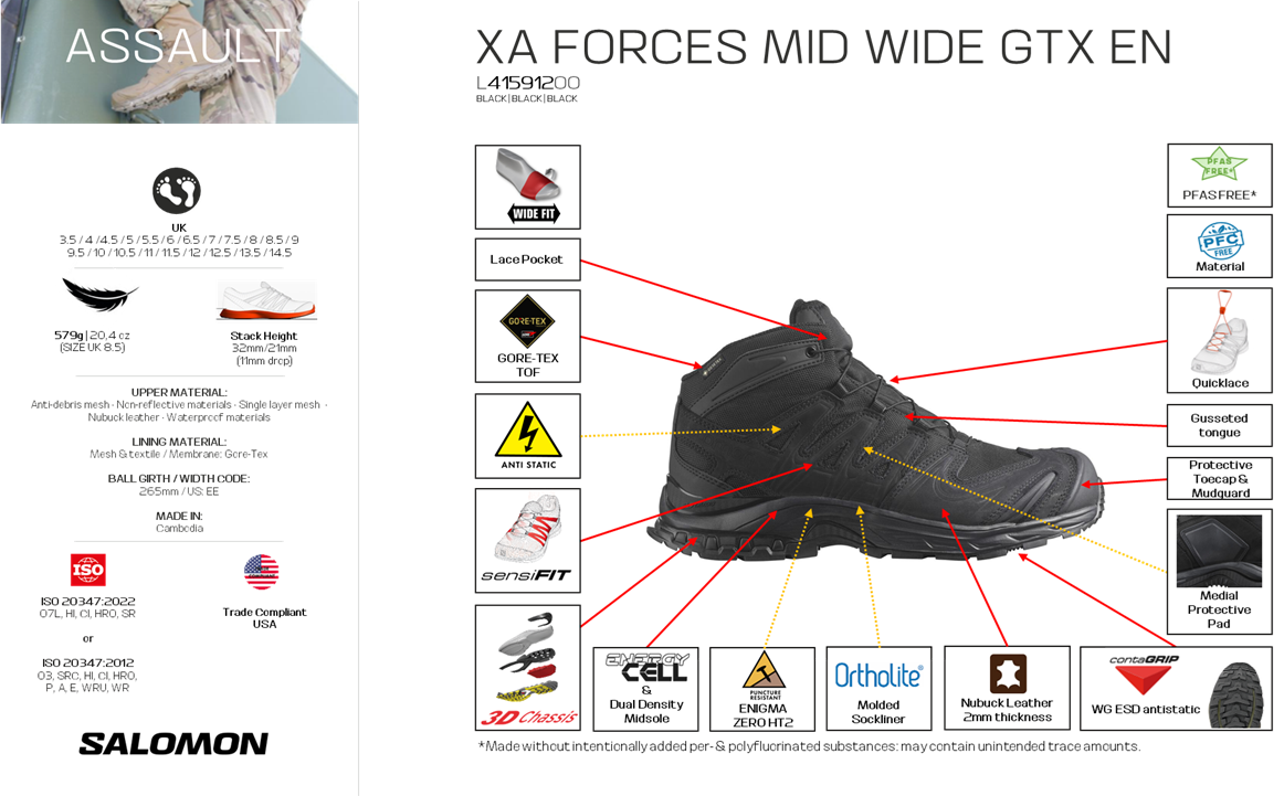 Designed for precise, fast and agile police or military operations. Inspired by possibly Salomon’s most famous trail running shoe, the XA Pro 3D. The ISO-certified XA FORCES MID WIDE GTX EN features a wider last and impresses with its athletic design, light weight, grip and versatility.